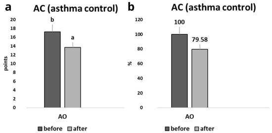 The author’s Asthma Control (AC) questionnaire (Appendix A). Changes in Asthma Control (AC) (a,b) scores in the asthma and overweight/obesity (AO) group before and after the intervention. (a) Raw AC scores before and after the intervention in the AO group. (b) Percentage improvement in asthma control. Values in rows with different letters (a, b) are significantly different, p ≤ 0.05 (One-way analysis of variance (ANOVA)).