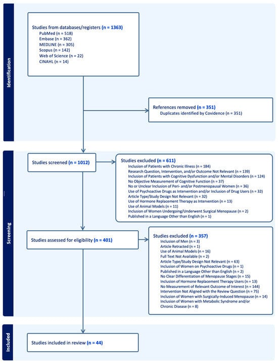 For the purpose of this narrative review, a literature search was conducted in PubMed, Embase, MEDLINE, Scopus, Web of Science, and CINAHL, where the search terms used include iron, perimenopausal menorrhagia, abnormal uterine bleeding, perimenopause, postmenopause, menopause, cognition, learning, executive function, attention, verbal, and memory. Inclusion criteria were articles investigating healthy human subjects who are classified as late pre-, peri-, and postmenopausal and not using hormone replacement therapy (HRT). A total of 1363 studies were initially identified, but 351 were duplicates. Thus, 1012 studies were screened. During screening, 611 studies were identified to be irrelevant due to the (1) inclusion of patients with chronic illness such as cancer, renal disease, and heart disease, (2) research question, intervention, and/or outcome not relevant for the scope of this review, (3) inclusion of patients with cognitive dysfunction and/or mental disorders such as schizophrenia and autism, (4) no objective measurement of cognitive function, (5) no or unclear inclusion of peri- and/or postmenopausal women, (6) use of psychoactive drugs as the intervention and/or inclusion of psychoactive drug users, (7) article type/study design not relevant, (8) use of HRT as the intervention, (9) use of animal models, (10) inclusion of women undergoing/who underwent surgical menopause, and (11) published in a language other than English. Within 401 studies that were assessed for eligibility, 357 were excluded due to there being (1) no measurement of a relevant outcome of interest, (2) intervention not aligned with the review question such as the use of HRT, (3) article type/study design not relevant, (4) use of animal models, (5) inclusion of HRT users, (6) no clear differentiation of menopause stages, (7) inclusion of women with surgically induced menopause, (8) inclusion of men within analyses, (9) inclusion of women with metabolic syndrome and/or chronic disease, (10) full text not available, (11) published in a language other than English, (12) article retracted, and (13) inclusion of women on psychoactive drugs. In total, 44 studies are discussed in this review article (Figure 1).