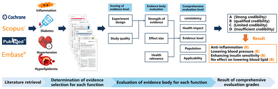 The method of assessing the quality of evidence was carried out according to the “Food and Health Evidence-Based Review” [10] modified from the World Health Organization guidelines [8]. The specific evaluation process is shown in Figure 1. To begin with, each trial should be evaluated by the strength of evidence, effect size, and health relevance. Then, scoring the evidence refers to calculating the average for each trial selected, and marked as excellent (13–16), good (9–12), medium (8), and poor (1–4). Then, the evidence body containing the whole trials is comprehensively evaluated based on consistency, health impact, grade, population, and applicability, and ultimately graded as A, B, C, and D. If the body of evidence for one health benefit is rated as A or B, it indicates that flaxseed oil has these health effects on the human body. The process of evidence evaluation and detailed evaluation criteria are shown in Figure 1 and Supplementary Table S1(a–j), respectively.