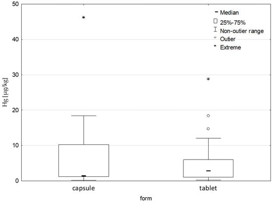 The arithmetic mean Hg content was higher in dietary supplements in the form of powders within capsules (6.83 µg/kg) compared to tablets (4.37 µg/kg), but these were not statistically significant differences.