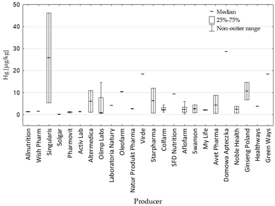 Studies on Hg in medicines and DSs were also conducted by Kowalski and Frankowski []. They mainly analyzed the Hg content in prescription and over-the-counter medicines available on the Polish market, as well as in DSs containing micro- and macroelements, DSs containing vitamins and DSs improving the condition of the skin, hair and nails. The average Hg concentration in these supplements was 5.5 µg/kg [], which was slightly lower than in the current study (5.8 µg/kg). The highest Hg content in DSs was in the vitamin supplement group, with a median value of approximately 7.5 µg/kg [].