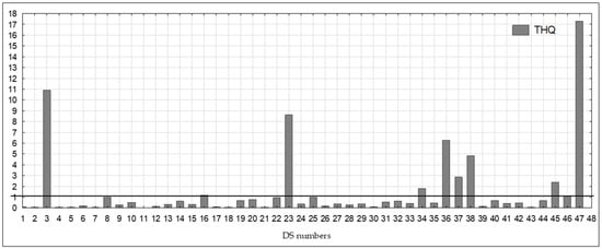 Sadowska-Rociek et al. [] also showed that the TWI values for Hg were lower than the levels established by EFSA. This indicates that there is no significant risk associated with the consumption of the tested products in the recommended dose. In the case of DSs containing ingredients of plant origin in the Puścion-Jakubik study [], the lowest TWI values were 0.001% and the highest 1.143%, with most samples having values ranging from 0.001 to 0.030%, thus being lower than in the current study. Our study showed that the Hg content in all tested DSs was below 100 µg/kg and did not exceed the maximum level set by the EU. The highest determined Hg value was half the maximum level. The RfD value according to the EPA is used to calculate the THQ value []. The THQ index seems to be a more sensitive indicator. Based on the calculated THQ values (THQ < 1), it was found that the consumption of most of the tested DSs and the risk of adverse health effects in the population are unlikely. For 11 samples of the tested DS, THQ values were ≥ 1. This referred to the preparations containing spirulina (N = 4), chlorella (N = 2), white mulberry extract (N = 2), African mango (N = 1), Garcinia cambogia (N = 1) and green tea extract (N = 1). THQ values ranged from 1 to 17.31—Figure 3. THQ values ≥ 1 indicate a possible risk of adverse health effects.