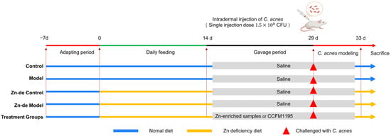 Our previous work identified Bifidobacterium longum subsp. longum CCFM1195 as a highly efficient Zn accumulator [23]. We hypothesize that oral administration of Zn-enriched CCFM1195 (Zn-CCFM1195) alleviates acne synergistically. To test this, we established a Zn-deficient mouse acne-like model via Zn-deficient feeding and dorsal injection of C. acnes. The alleviating effect of Zn-CCFM1195 was evaluated alongside multiple controls: ZnSO4, non-Zn-enriched CCFM1195, and a physical mixture of CCFM1195+ZnSO4. Both viable and inactivated bacterial controls were included to ensure experimental reliability.