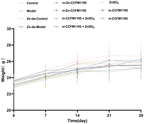 All mice were randomly divided into 11 groups: (1) Control group (Control), (2) Model group (Model), (3) Zn-deficient Control group (Zn-de-Control), and (4) Zn-deficient Model group (Zn-de-Model). The remaining groups received Zn supplementation: (5) viable Zn-enriched CCFM1195 (vi-Zn-CCFM1195), (6) inactivated Zn-enriched CCFM1195 (in-Zn-CCFM1195), (7) viable CCFM1195 mixed with ZnSO4 (vi-CCFM1195+ZnSO4), (8) inactivated CCFM1195 mixed with ZnSO4 (in-CCFM1195+ZnSO4), and (9) Zn sulfate group (ZnSO4). Additionally, separate groups were established for bacterial treatments: (10) viable CCFM1195 group (vi-CCFM1195) and (11) inactivated CCFM1195 group (in-CCFM1195).