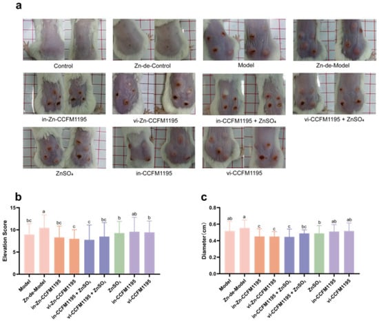 We evaluated the severity of the lesions by measuring the diameter and calculating elevation scores. Figure 2 indicates there was no significant difference in body weight between groups during the Zn deficiency and Zn supplementation phases. After intradermal injection of C. acnes, the Control and Zn-de-Control groups exhibited no significant skin injury, whereas the Model and Zn-de-Model groups developed pustules on the dorsal skin, with the Zn-de-Model group showing greater severity (Figure 3a). Compared with the Zn-de-Model group, the Zn supplement groups demonstrated reduced pustule size, increased scarring, and significantly lower elevation scores and diameters (Figure 3). The Zn-CCFM1195 (including in-Zn-CCFM1195 and vi-Zn-CCFM1195) and CCFM1195+ZnSO4 (including in-CCFM1195+ZnSO4 and vi-CCFM1195+ZnSO4) showed a more pronounced reduction in elevation scores compared to ZnSO4 alone, though no significant differences were observed among these four groups (Figure 3b). The lesion diameters in the groups treated with in-Zn-CCFM1195, vi-Zn-CCFM1195, in-CCFM1195+ZnSO4, and vi-CCFM1195+ZnSO4 were significantly reduced to 0.45, 0.44, 0.45, and 0.49 cm, respectively, compared to the 0.55 cm observed in the Zn-de-Model group (Figure 3c). Meanwhile, both in-CCFM1195 and vi-CCFM1195 interventions resulted in a slight reduction in lesions elevation scores and diameter in mice, though their effects were less pronounced compared to Zn-CCFM1195 and CCFM1195+ZnSO4.