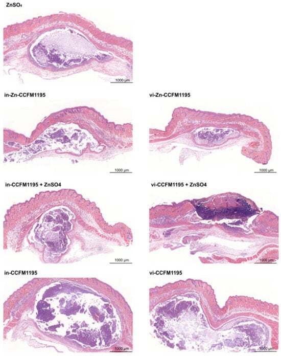 As shown in Figure 4, in the sham-injected groups, the epidermis appeared intact with uniform thickness, and no significant abnormalities were observed in the dermis or subcutaneous tissue. In contrast, C. acnes-induced modeling resulted in acute inflammation, characterized by an abundance of granulocytes and necrotic cell debris in the dermis (indicated by blue arrows) or subcutaneous area (indicated by red arrows), forming localized abscesses. In the Model and Zn-de-Model groups, pronounced epidermal thickening was observed near the injection site, which was significantly greater than that in both the Control and Zn-de-Control groups (indicated by black arrows). As shown in Figure 5, compared with the Model and Zn-de-Model groups, Zn supplementation significantly reduced inflammatory cell infiltration. However, neither in-CCFM1195 nor vi-CCFM1195 treatment showed significant effects compared to the Zn-de-Model. Importantly, the Zn-CCFM1195 and CCFM1195+ZnSO4 groups demonstrated more restricted inflammatory infiltration than ZnSO4 alone. Epidermal thickness remained unchanged across all treatment groups.
