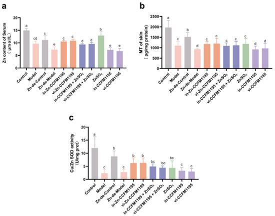 Zn status indicators of serum and skin. (a) Zn content in serum, (b) MT content in skin, (c) Cu-Zn SOD activity in skin. The results are presented as means ± SDs. Different superscript letters indicate statistically significant differences among groups (p < 0.05).