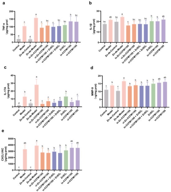 Effects of Zn products on inflammatory mediators in the skin. (a) TNF-α levels, (b) IL-1β levels, (c) IL-17A levels, (d) MMP9 levels, (e) CXCL1/KC levels. The results are presented as means ± SDs. Different superscript letters indicate statistically significant differences among groups (p < 0.05).