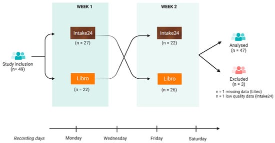Cross-sectional experimental design and participant flow: Forty-nine participants were included in this study and assigned to each study branch by alternation. Twenty-two participants recorded their food intake using the Libro app on three alternative days (i.e., Monday, Wednesday, and Friday) and one weekend day (i.e., Saturday) during week 1. In the subsequent week (week 2), they followed the same recording protocol using Intake24. Twenty-seven participants first recorded their diet with Intake24, and subsequently with Libro. One participant failed to record their diet with Libro and was thus excluded from the analysis. One further participant was excluded due to implausible reporting of energy intake higher than 5000 Kcal with Intake24. Created with BioRender.com.