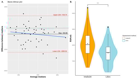 Group-level analysis between methods for 47 participants. (A) Bland–Altman plot: The differences between the medians of SRs are plotted against the averages of the medians, with limits of agreement indicated by the dashed red lines and bias by the continuous black line. The blue line is used to investigate if any trend in the differences across the range of measurements exists. (B) Violin and box plots: Violin and box plots of average energy intake (EI) in Kcal per participant as recorded by Intake24 (orange) and Libro (light blue). Triangles represent outliers. ***: p-value < 0.001.