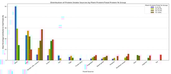 Distribution of protein intake sources by percentage of plant protein contribution to total protein intake in each group in children 9–18 years old. Group 1: 0–24.9% plant protein. Group 2: 24–49.9%. Group 3: 50–74.9%. Group 4: 75–100%. Data according to a single 24 h dietary recall from the Canadian Community Health Survey (CCHS) 2015, based on data from Canadian children and adolescents aged 9–18 years.