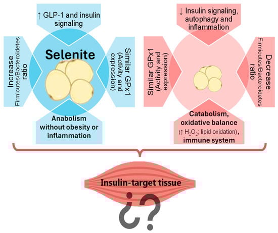 Our studies have demonstrated the contrasting effects of selenite and Se NPs supplementation on AT. In fact, selenite supplementation was shown to promote adipogenesis via the insulin signaling pathway in WAT (Figure 1). Conversely, SeNP administration prevented fat accumulation in WAT by decreasing insulin signaling and promoting FOXO3a-mediated autophagy, a cellular recycling process, leading to reduced inflammation [10]. Notably, these effects were independent of GPx1 expression or activity. This selenoprotein has the lowest Se hierarchy, being highly sensitive to Se status; therefore, it is usually used to evaluate tissue Se levels [13]. The similar GPx1 values found in both groups confirm that both treatments used the same dose of Se, and that alternative mechanisms are involved [10]. In this regard, the possibility of an implication of the microbiota–liver–bile salt axis as a novel mechanism underlying the divergent effects of selenite and SeNPs on adipose tissue development was investigated. Selenite primarily affected the liver, decreasing the farnesoid X receptor (FXR) activity, and leading to bile salt accumulation, to an increased Firmicutes/Bacteroidetes ratio in the gut microbiota, and to a greater secretion of GLP-1. In contrast, SeNPs primarily impacted the gut microbiota, shifting it towards a more Gram-negative profile enriched in Akkermansia and Muribaculaceae, and decreasing the Firmicutes/Bacteroidetes ratio [11]. This microbial profile was associated with lower WAT mass, and SeNPs did not alter the pool of circulating bile salts. Transcriptomics of the WAT have shed some light on the mechanisms underlying the differential effects of selenite and SeNPs on gene expression in WAT [12]. SeNP supplementation led to a greater number of differentially expressed genes and impacted more cellular processes than selenite. Specifically, SeNPs upregulated genes associated with the immune system, catabolism, the mitochondrial function, and the oxidative balance. Gene ontology and KEGG pathway enrichment analyses revealed increased catabolic activity and decreased growth signaling in the SeNP group, contributing to a reduced WAT mass. Despite increased antioxidant enzyme activity, SeNP-treated rats also showed elevated H2O2 and malondialdehyde levels, indicating a complex interplay with oxidative stress (OS) [12]. These findings suggested a potential role for SeNPs in WAT reduction and immune response modulation during adolescence.