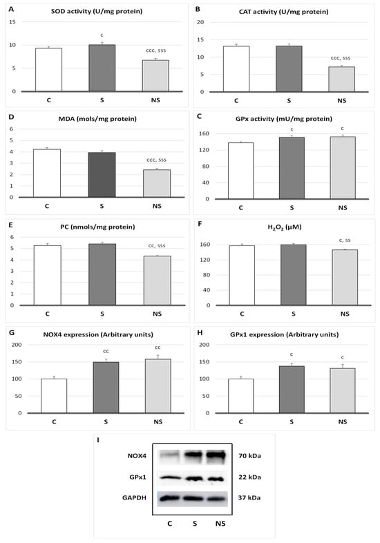 Oxidative balance in skeletal muscle of adolescent rats after treatment with selenite or SeNPs. (A) Superoxide dismutase (SOD) activity; (B) catalase (CAT) activity; (C) glutathione peroxidase (GPx) activity; (D) malondialdehyde levels (MDA), showing lipid peroxidation; (E) protein carbonyl group (PC), showing protein oxidation; (F) hydrogen peroxide (H2O2) concentration, a reactive oxygen species (ROS); (G) NADPH oxidase 4 (NOX4) expression; (H) glutathione peroxidase 1 expression; and (I) Western blot expression images with GAPDH as load control. The results were expressed as means ± SEMs and analyzed using a multifactorial one-way ANOVA followed by Tukey’s test. The number of animals used in each group is n = 6. Experimental groups: C, control group; S, selenite group; NS, SeNP group. Significance: vs. C, c p < 0.05, cc p < 0.01, ccc p < 0.001; vs. S, ss p < 0.01, sss p < 0.001.