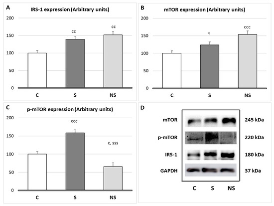 (A) Expression of the proteins Insulin receptor substrate 1 (IRS-1); (B) mammalian target of rapamycin (mTOR); (C) phospho-mTOR (Ser2448) (p-mTOR) after treatment with selenite or SeNPs in SKM; and (D) Western blot expression images with GAPDH as a loading control. The results were expressed as means ± SEMs and analyzed using a multifactorial one-way ANOVA followed by Tukey’s test. The number of animals used in each group is n = 6. Experimental groups: C, control group; S, selenite group; NS, SeNP group. Significance: vs. C, c p < 0.05, cc p < 0.01, ccc p < 0.001; vs. S, sss p < 0.001.