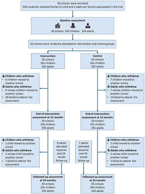 - White, J.; Holliday, J.; Daniel, R.; Campbell, R.; Moore, L. Diffusion of effects of the ASSIST school-based smoking prevention intervention to non-participating family members: A secondary analysis of a randomized controlled trial. Addiction 2020, 115, 986–991. [Google Scholar] [CrossRef]