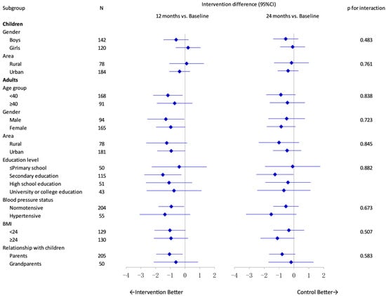 | Intervention Group | Control Group | Adjusted Difference in Change (Intervention vs. Control) | ||||