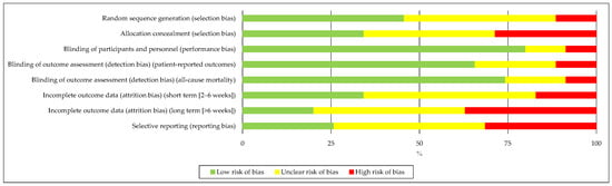 The items on the checklist were classified into different areas: random sequence generation (selection bias), allocation concealment (selection bias), blinding of participants and personnel (implementation bias), blinding of outcome assessment (detection bias), incomplete outcome data (attrition bias), selective reporting (reporting bias), and other types of bias. They were classified as ‘low’ if they met the criteria for negligible risk of bias (plausible bias that does not seriously alter the results) or ‘high’ if they met the criteria for high risk of bias (plausible bias that seriously undermines confidence in the results). If the risk of bias was unknown, it was considered ‘uncertain’ (plausible bias that casts some doubt on the results) [].