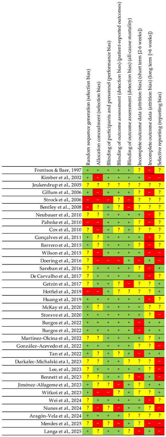 Summary of risk of bias, indicating the level of bias for each domain in each study. Red colour: elevated level of bias; Green colour: low level of bias; Yellow colour: unclear level of bias; +: possibility of low bias level; −: possibility of high bias level; ?: possibility of undetermined bias [,,,,,,,,,,,,,,,,,,,,,,,,,,,,,,,,,,].