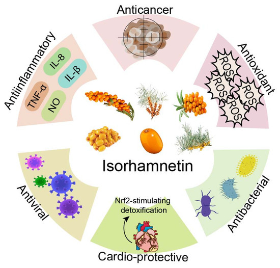 Isorhamnetin (ISO) is a flavonoid with important bioactivities, and its main natural sources include the tissues and organs of leaves, flowers, and fruits from sea buckthorn (Hippophae rhamnoides L.) and ginkgo biloba (Ginkgo biloba L.). In terms of traditional medicinal value, sea buckthorn fruits are effective in strengthening the spleen and eliminating food, relieving cough and phlegm, activating blood circulation, and eliminating blood stasis. Ginkgo biloba is widely used in therapeutic areas such as activating blood circulation and eliminating blood stasis, clearing the blood channels to alleviate pain, astringing the lungs to calm wheezing, and lowering lipid levels. Recent studies have shown that ISO is a key active ingredient in medicinal plants that exert pharmacological effects.