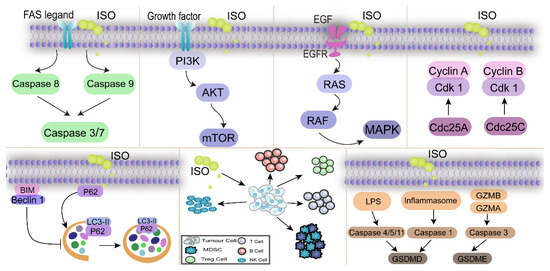 Mechanism of action of ISO against cancers. The arrows represent the role of promotion in the diagram.