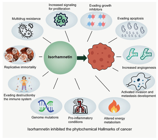 Pyroptosis plays an important role in defending against multiple diseases such as cancer. With increasing research on the pyroptosis pathway in recent years, its potential application in disease therapy has gradually emerged, providing new avenues for the treatment of related diseases [43]. Wendlocha et al. systematically investigated the inhibitory effects of several flavonols, including ISO, on cancer. That study evaluated the potential of such compounds in targeting different types of cancer cell death pathways and found that flavanols could induce cell death via multiple mechanisms, including pyroptosis [44]. These findings not only help to clarify the anticancer mechanisms of flavonols such as ISO but also provide an important theoretical basis for the future development of drug regimens based on the pyroptosis pathway [44]. The mechanisms leading to the anticancer effects of ISO are summarized in Figure 3.