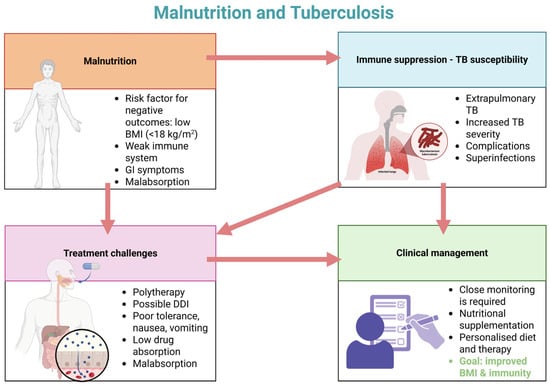 It is noteworthy that malnutrition is not only a result of Mycobacterium tuberculosis infection but also a well-established risk factor for its development. Many individuals—particularly in high-burden areas—show signs of underlying undernutrition before TB diagnosis. By weakening epithelial barriers, thus compromising immune responses, and so changing systemic metabolic pathways, this reduced nutritional status provides a biological milieu fit for infection. Moreover, as it alters medication absorption, distribution, metabolism, and excretion—variables that might result in subtherapeutic drug levels, higher toxicity, and worse treatment efficacy—malnutrition also affects the pharmacological therapy of TB (Figure 2).