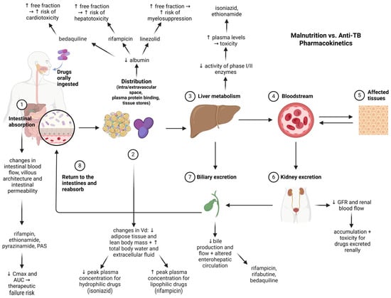 Malnutrition is a primary risk factor for TB and can also have detrimental effects on anti-TB drug therapy. Figure 2 illustrates the primary physiopathological alterations induced by malnutrition that can affect the pharmacokinetics of anti-TB agents.