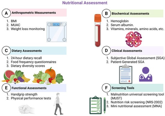 Nutritional assessment tools (created with Biorender.com). This figure summarises six main domains of nutritional assessment: Anthropometric Measurements including body mass index (BMI), Mid-Upper Arm Circumference (MUAC), and weight loss monitoring; Biochemical Assessments such as haemoglobin, serum albumin, and micronutrient (vitamins, minerals, amino acids) levels; Dietary Assessments including 24 h dietary recall, food frequency questionnaires, and dietary diversity scores; Clinical Assessments using the Subjective Global Assessment (SGA) and Patient-Generated SGA (PG-SGA); Functional Assessments like handgrip strength and physical performance tests; and Screening Tools such as the Malnutrition Universal Screening Tool (MUST), Nutrition Risk Screening (NRS-2002), and Mini Nutritional Assessment (MNA).