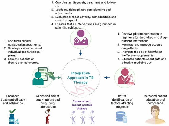 An interdisciplinary approach to managing TB can improve patient health outcomes, adherence and the efficacy of therapy []. In this regard, nutritionists play a particularly important role. These specialists can contribute significantly to increasing adherence to an appropriate nutritional plan for the TB patient, which may promote faster recovery rates. Thus, the development of balanced nutritional plans is necessary to improve the health status []. A correct and balanced nutritional intake has been positively correlated with increased treatment compliance in TB patients and has demonstrated long-term beneficial effects []. Furthermore, the involvement of the clinical pharmacist for the management of possible drug–drug or nutrient–drug interactions and the optimisation of pharmacotherapeutic plans and their adaptation to the needs of the TB patient is necessary in efforts to personalise therapy and increase patient-centred care. This direction is even more significant in MDR TB patients, where poor adherence to treatment significantly affects health outcomes [,]. Cooperation among healthcare professionals helps to ensure that drug schedules meet a patient’s dietary requirements, therefore focusing on both pharmacological and nutritional aspects of TB treatment.