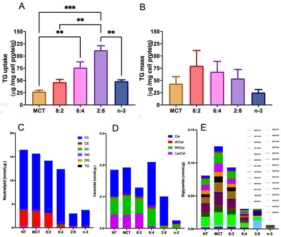 n-3 TG combined with MCT increase cellular uptake in immune cells. J774 macrophage cells were incubated with [3H]CE-labeled pure MCT, n-3 TGRP or TGRP in which n-3 TG was mixed with MCT (MCT:n-3 8:2, MCT:n-3 6:4, MCT:n-3 2:8) at 37 °C for 4 h (200 µg TG/mL). Cellular TG uptake (A) and cell TG mass deposition (B) were measured and analyzed as described in the Methods. Data were expressed as the mean ± SEM (n = 3–5) and denoted as ** p < 0.01, *** p < 0.001, utilizing one-way ANOVA followed by Tukey’s multiple comparisons. Cellular lipids were extracted from 3 replicate samples (~3 million cells) for the measurement of neutral lipids, including free cholesterol (FC), cholesterol ester (CE), acyl carnitines (AC) and glycerides (MG, DG and TG) (C), ceramide species, including ceramides (Cer), dihydroceramides (dhCer), monohydroceramides (mhCer) and lactosylceramides (LacCer) (D), and diglycerides (DG) with different chain lengths (E) through lipidomic analysis.
