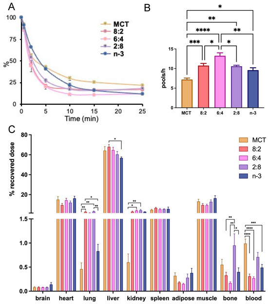We also investigated organ uptake in mice administered mixed MCT and n-3 TGRP compared to those injected with pure MCT or n-3 TGRP (Figure 2C). While similar tissue uptake and distribution patterns were observed among mice that received IV injections of TGRP, with over 60% of particles taken up by the liver, the mice injected with mixed MCT/n-3 8:2 and 6:4 TGRP demonstrated increased liver uptake attributed to accelerated blood clearance rates and FCR. On the other hand, mixed MCT and n-3 TGRP at 2:8 consistently showed a greater proportion of non-hepatic tissue uptake, including bone, similar to that in the mice injected with pure MCT (Figure 2C).