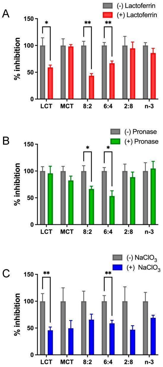 The uptake or transfer of model TGRP can be mediated by membrane-bound receptors (LDL receptor, apoE), membrane proteins (HSPG, FA transporter), receptor components such as LDL-R-associated protein (LRP), or LpL. We used well-characterized inhibitors at major catabolic uptake checkpoints to define the cellular pathways of MCT:n-3 TGRP at ratios of 8:2, 6:4, or 2:8 in innate immune cell and mouse models. Lactoferrin is known to inhibit the clearance of remnant lipoproteins from the plasma and competes with the cell-surface binding of apolipoprotein (apo)E-enriched remnants. Additionally, lactoferrin also inhibits remnant binding and the uptake of TGRP by interacting with both heparan sulfate proteoglycans (HSPG) and LRP. As expected, the presence of lactoferrin decreased LCT uptake in macrophages by 45% [,]. Major reductions in cellular TG uptake or mass deposition were also observed in cells treated with MCT:n-3 8:2 and 6:4 TGRP with the addition of lactoferrin (Figure 3A). To examine whether the cell proteoglycans may serve as a non-classical mediator in the uptake pathway for MCT:n-3 emulsions, we used sodium chlorate (NaClO3) and pronase to inhibit the synthesis of proteoglycans and to remove cell-bound proteins, respectively. Pre-incubation with pronase reduced uptake mainly in cells treated with MCT:n-3 8:2 and 6:4 TGRP. While NaClO3 decreased cellular TG uptake in LCT-treated cells by 50% (p < 0.05), significant reductions in cellular TG uptake (p < 0.05) were also observed in cells incubated with MCT:n-3 6:4 TGRP in the presence of NaClO3 (Figure 3C). TG cell mass deposition for all tested TGRP with inhibitors displayed a similar trend (ns) to TG uptake.