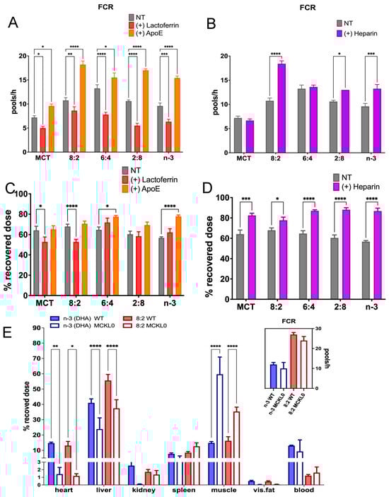 Metabolic uptake pathways of MCT and n-3 TGRP in vivo. C57BL/6J mice were intravenously injected with [3H]CE-labeled emulsions (0.016 mg TG/g BW) in the absence of the presence of (A) lactoferrin (0.07 mg/g BW), apoE, or (B) heparin (0.4 units/g BW) injected 1 min before TGRP injection. Fractional catabolic rates (FCR) were assessed as described in the Methods. (C) Hepatic uptake of TGRP in mice treated with lactoferrin and apoE. (D) Hepatic uptake of TGRP in mice treated with heparin. (E) Organ uptake of TGRP in LpL-knockout mice (insert: FCR). Data were expressed as Mean ± SEM, * p < 0.05, ** p < 0.01, *** p < 0.001, **** p < 0.0001, utilizing 2-way ANOVA followed by Dunnett’s multiple comparisons ((A–D), n = 4 or 5), or Tukey’s multiple comparisons ((E), n = 3–8).