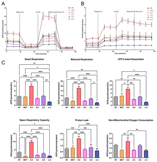 Mitochondrial β-oxidation is a key energy-generating pathway. Medium-chain FAs enter the mitochondrial matrix via passive diffusion, bypassing CPT-1, whereas how long-chain n-3 FAs are oxidized in the presence of MCT remains unclear. We determined whether experimental MCT:n-3 TGRP at different levels affects FA metabolism in macrophage cells using the Seahorse analytical bioenergetics approach []. Our data show that the overall mitochondrial OCR was upregulated only by MCT:n-3 8:2 TGRP compared to that in the non-treated control cells or cells treated with other TGRP (Figure 5A). The glycolytic flux measured by ECAR was also significantly increased by 8:2 TGRP compared to the control (Figure 5B). Other TGRP, such as 6:4 and 2:8, displayed little or no change in OCR and ECAR compared to the control (Figure 5A,B). The analysis of specific mitochondrial function parameters shows that the 8:2 TGRP significantly increased basal and maximal respiration, ATP production, and spare respiratory capacity. On the other hand, pure n-3 TGRP caused a significant reduction in overall mitochondrial respiration and functional indicators (Figure 5C). Similar changes in non-mitochondrial oxygen consumption were observed in these macrophage cells.