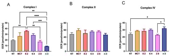 To unveil the underlying mechanism of the decreased OCR and ECAR mediated by n-3 TGRP treatment, we examined whether this is associated with the activity of major respiratory enzymes, such as complexes II, III, and IV, and the FA oxidation flux pathways [] in model macrophage cells. Our results confirm that MCT:n-3 8:2 activated complex I activity. Importantly, increasing n-3 TG content suppressed complex I activity, which may lead to reduced ROS production. The cellular oxidative phosphorylation appeared preserved by the increased complex IV activity in cells treated with higher n-3 content. (Figure 6).