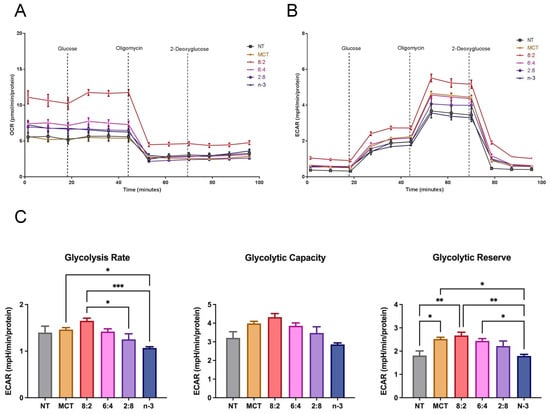 We also evaluated glycolytic function in macrophage cells following treatment with different TGRPs (Figure 7). The MCT:n-3 8:2 TGRP increased OCR and ECAR compared to control (Figure 7A,B) in instigating glycolysis using a series of metabolic modulators. Pure MCT, 6:4, and 2:8 TGRP also increased ECAR, while pure n-3 TGRP caused a slight decline in ECAR. Overall, the glycolytic rate was mildly increased with 8:2 TGRP but not significantly compared to the control. Glycolytic capacity was increased after treatment with all TGRPs except for n-3 TGRP, with no significant differences observed. The glycolytic reserve was significantly higher in cells treated with 8:2 and 6:4 emulsions (p < 0.05), indicating greater flexibility and capacity to adapt by increasing glycolytic rates upon inhibiting mitochondrial respiration.