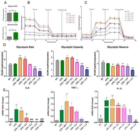 Cellular metabolism in macrophages after inflammatory stimulation and treatment with MCT and n-3 TGRP in vitro. (A) Baseline OCR and ECAR measurements were taken from non-stimulated J774 macrophages and those incubated with LPS (1 µg/mL for 24 h). **** p < 0.0001; Unpaired t-test results were used. The (B) OCR and (C) ECAR were assessed using the Glycolysis Stress Test and the Seahorse Extracellular Flux Analyzer. LPS-stimulated macrophage cells were subsequently injected with glucose, oligomycin, and 2-DAG to evaluate glycolytic function, either with no treatment or treatment with MCT, n-3 TGRP, or TGRP, where n-3 TG was mixed with MCT. (D) Glycolytic parameters were calculated based on ECAR data obtained from the Glycolysis Stress Test. * p < 0.05, ** p < 0.01, *** p < 0.001 when compared with the LPS group via one-way ANOVA. (E) The mRNA fold change of pro-inflammatory markers in J774 macrophage cells stimulated with LPS and treated with various TGRPs was assessed. n = 5; * p < 0.05, ** p < 0.01, compared with the NT group; # p < 0.05, ## p < 0.01, ### p < 0.001 compared with the LPS group. Analyzed using one-way ANOVA with Dunnett’s multiple comparisons.