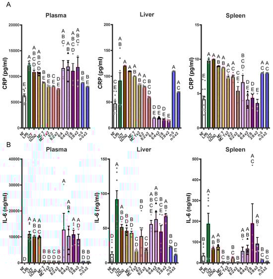 To evaluate the potential anti-inflammatory effects of n-3 containing TGRP in vivo, we measured the levels of C-reactive protein (CRP) and IL-6 in the plasma and metabolic tissue homogenates (liver and spleen) of mice following various doses of LPS injections by enzyme-linked immunosorbent assay (ELISA) using commercially available kits (CRP ELISA kits from Invitrogen (Carlsbad, CA, USA) and IL-6 ELISA kits from R&D Systems (Minneapolis, MN, USA) [,,,,,]. Our validation data indicate that, with a reduction in WBC and platelets, specific immune cell subsets involved in the innate immune response, notably monocytes and neutrophils, increased in mice 24 h post-LPS stimulation at doses ranging from 2 to 8 mg/kg BW (Supplemental Figure S1A). We selected a dosage of 2 mg LPS/kg BW for further analyses, as it induced comparable effects on increasing WBC subsets and the key plasma inflammatory indicator CRP levels determined by ELISA when compared to the higher doses (4 or 8 mg LPS) (Supplemental Figure S1B). Consistent with previous reports, this dose did not cause mortality []. Plasma CRP and IL-6 sharply increased between 4 and 8 h post-LPS. While IL-6 concentrations gradually declined after 4 h, CRP concentrations remained high at 24 h after the LPS injection (Supplemental Figure S1C). With the selected LPS dosing regime, the mice were administered various TGRPs before or after the LPS challenge. Plasma was collected post-injection via cardiac puncture while liver and spleen tissues were excised, weighed, and homogenized in lysis buffer containing protease inhibitors. The homogenates were centrifuged, and the supernatants were used for ELISA according to the manufacturer’s protocols. For both CRP and IL-6 assays, samples and standards were added to antibody-precoated plates, incubated, and then probed with detection antibodies, followed by substrate addition to develop the colorimetric reaction measured at a specific wavelength.