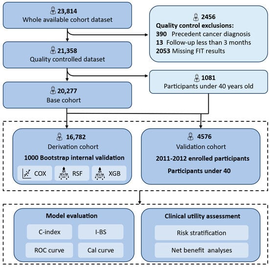 Of the initial 23,814 registered volunteers (aged 23–79 years), 21,634 participants remained after excluding those with missing FIT results, a prior cancer diagnosis, or follow-up durations shorter than three months. For model development and validation, we focused on 20,277 participants aged over 40 years—aligned with CRC screening guidelines by the Chinese CDC and international recommendations [31]. A training and internal validation cohort (n = 16,872) comprised individuals enrolled from 2008 to 2010. External validation was conducted on 3405 individuals recruited from 2011 to 2012. Additionally, 1081 participants under 40 years of age were included to ensure conservative model validation and improve robustness given the lower CRC incidence in younger populations (Figure 1).