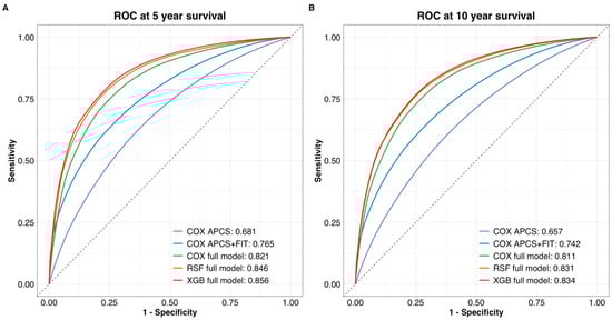 Time-dependent ROC curves for (A) 5-year and (B) 10-year colorectal cancer survival prediction. The Cox full model showed improved discrimination over the base and FIT-enhanced models. XGBoost achieved the highest AUC at both time points, followed by RSF. ROC curves were generated using the validation cohort.