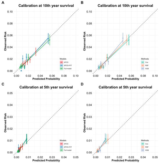 (A) Calibration curve for 10-year survival across different models (APCS, APCS + FIT, and Full model) for predicted probability vs. observed risk. (B) Calibration curve for 10-year survival across three modeling methods (Cox, RSF, XGBoost) using the full model for predicted probability vs. observed risk. (C) Calibration curve for 5-year survival across different models (APCS, APCS + FIT, and full model) for predicted probability vs. observed risk. (D) Calibration curve for 5-year survival across three modeling methods (Cox, RSF, XGBoost) using the full model for predicted probability vs. observed risk.
