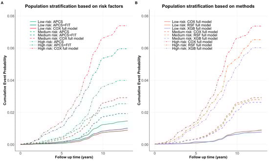 (A) Cumulative event probabilities across three models (APCS, APCS + FIT, full model). (B) Cumulative event probabilities across three modeling methods (Cox, RSF, XGBoost) using the full model risk factors. Each color represents a specific model, while risk level is distinguished by the line type. All methods demonstrated consistent risk separation over time, with the largest divergence observed in the high-risk group.