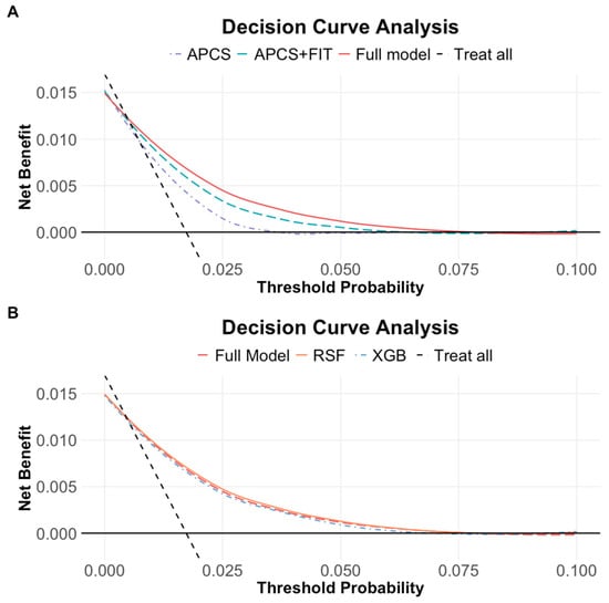 (A) Decision curve analysis across three models (APCS, APCS + FIT, full model). (B) Decision curve analysis across three modeling methods (Cox, RSF, XGBoost). The solid black line represents a no-screening strategy, and the dashed line represents screening all. At low threshold probabilities, large portions of individuals are recommended for screening, resulting in the highest net benefit. All three models showed comparable net benefit, with performance declining gradually as the threshold increased.