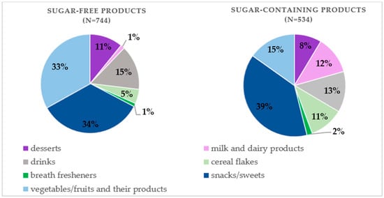 Products were divided into two main groups: products labeled as “without added sugar” (N = 744) and products containing sugar (N = 534). The “no added sugar” category includes products which, in accordance with Regulation (EU) No. 1333/2008 [17], do not contain added mono- or disaccharides but may contain naturally occurring sugars, e.g., from fruit or milk. Product categories were defined based on the practical retail classification and included desserts, milk and dairy products, beverages, cereals, breath-freshening products, snacks/sweets, and vegetables/fruits and dairy products. The proportion of products within each category is presented in Figure 1. To ensure the anonymity of the results, each product was assigned a unique numerical identifier. The data was organized in a database using Microsoft Excel software, which facilitated efficient processing and statistical analysis of the dataset.