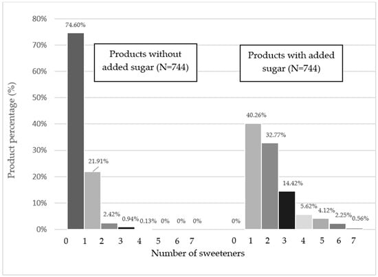 An analysis of the number of sweeteners per product revealed that the majority of products labeled “without added sugar” did not contain any sweeteners, whereas products with added sugar most frequently contained a single sweetener. The use of multiple sweeteners was considerably more prevalent among sweetened products, with some items containing up to seven distinct sweeteners. The above results are presented in Figure 2.