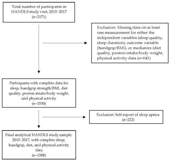 The sample consisted of 1308 individuals with complete data on independent, outcome, and mediator variables who were interviewed and examined in the second follow-up wave of the HANDLS study, 2013–2017 (n = 2171) (Figure 1). Participants missing data on any of the independent, outcome, or mediator variables or self-reporting sleep apnea were excluded from the analytical sample (Figure 1). The review board of the National Institutes of Health approved the protocol and written informed consent was obtained from all Healthy Aging in Neighborhoods of Diversity across the Life Span (HANDLS) study participants. This prospective cohort study was designed to explore the effects of race and socioeconomic factors on health disparities. Details of the objectives and design of the HANDLS study, a prospective study initiated in 2004, have been described in previous publications [,] and on the study’s website (https://handls.nih.gov/01Design.htm, accessed on 28 May 2025) The characteristics of the sample are presented in Table 1.