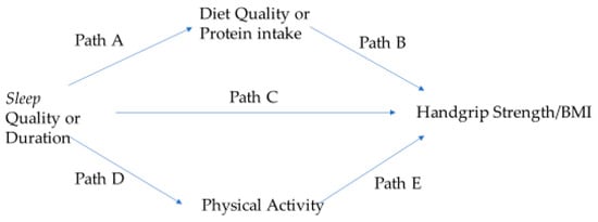 Relationships also exist among protein intake, diet quality, and handgrip strength. Our previous research found that high diet quality, along with total protein and essential amino acid intakes, were associated with better handgrip strength relative to body mass index (BMI) [,]. Other researchers have also reported on this relationship [,,]. Jun and colleagues documented that a dietary protein intake of ≥1.2 g per kg of body weight was associated with greater handgrip strength relative to BMI, compared to a lower protein intake, among middle-aged adults in the 2011–2014 National Health and Nutrition Examination Survey (NHANES) []. Across all US adult participants in the NHANES, 2011–2014, handgrip strength increased with increasing quartiles of dietary intakes of total protein, animal protein, plant protein, and leucine []. Using data from the Korean National Health and Nutrition Survey, 2016–2019, Kim and colleagues reported that older women with protein intakes higher than the estimated requirement were at lower risk of low handgrip strength []. To our knowledge, there are no publications exploring the role of protein or diet quality as mediators of the relationship between sleep and handgrip strength.