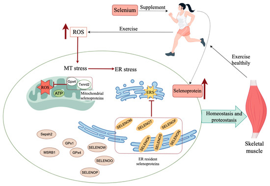 Se mediates its physiological roles in mammals predominantly through selenoproteins. Of the 25 selenoproteins identified thus far in mammals, two (GPX4 and TXNRD2) are classified as mitochondrial selenoproteins, while seven others (DIO2, SELENOF, SELENOK, SELENOS, SELENOM, SELENON, and SELENOT) are localized in the endoplasmic reticulum [5]. These selenoproteins have the ability to regulate mitochondrial and endoplasmic reticulum (ER) homeostasis. Previous studies have focused on the function of individual selenium proteins. Jing et al. showed that the biological function of selenoproteins is not a single one, but a synergistic function of multiple selenoproteins [12]. We describe the mechanisms by which selenium supplementation exerts its effects in muscle cells in the form of selenoproteins to promote exercise fitness in Figure 1.