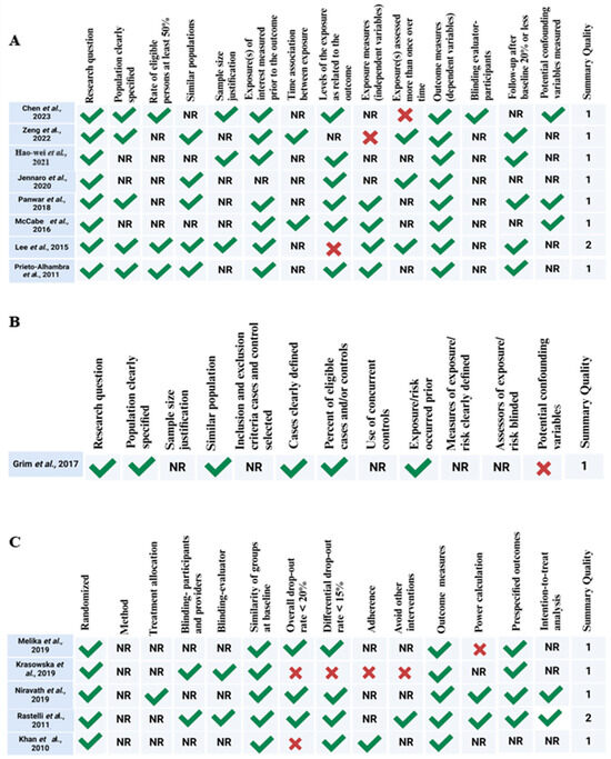 (A) Summary of risk-of-bias assessment according to the National Institutes of Health Quality Assessment Tool for Observational Cohort and Cross-Sectional Studies (NIH, 2014) [30,31,33,37,38,39,42,43]. (B) Summary Quality Assessment of Case–Control Studies [32]. (C) Summary Quality Assessment according to Health Quality Controlled Intervention Studies (NIH, 2014) [34,35,36,40,41]. The quality rating is 0 for poor (0–4 out of 14 questions), 1 for fair (5–9 out of 14 questions), or 2 for good (>10 out of 14 questions). NR: not reported; created with BioRender (https://www.biorender.com/ accessed on 1 July 2024).