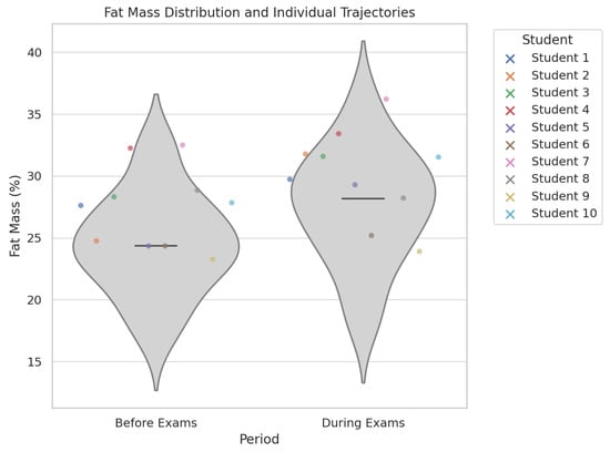 Figure 2. This figure illustrates individual trajectories in fat mass for a random subset of 10 participants, for visualization purposes. Violin and box plot of fat mass distribution before and during exams, including individual trajectories for a subset of 10 students. The figure highlights both the shift in distribution and the within-subject variability associated with academic stress.